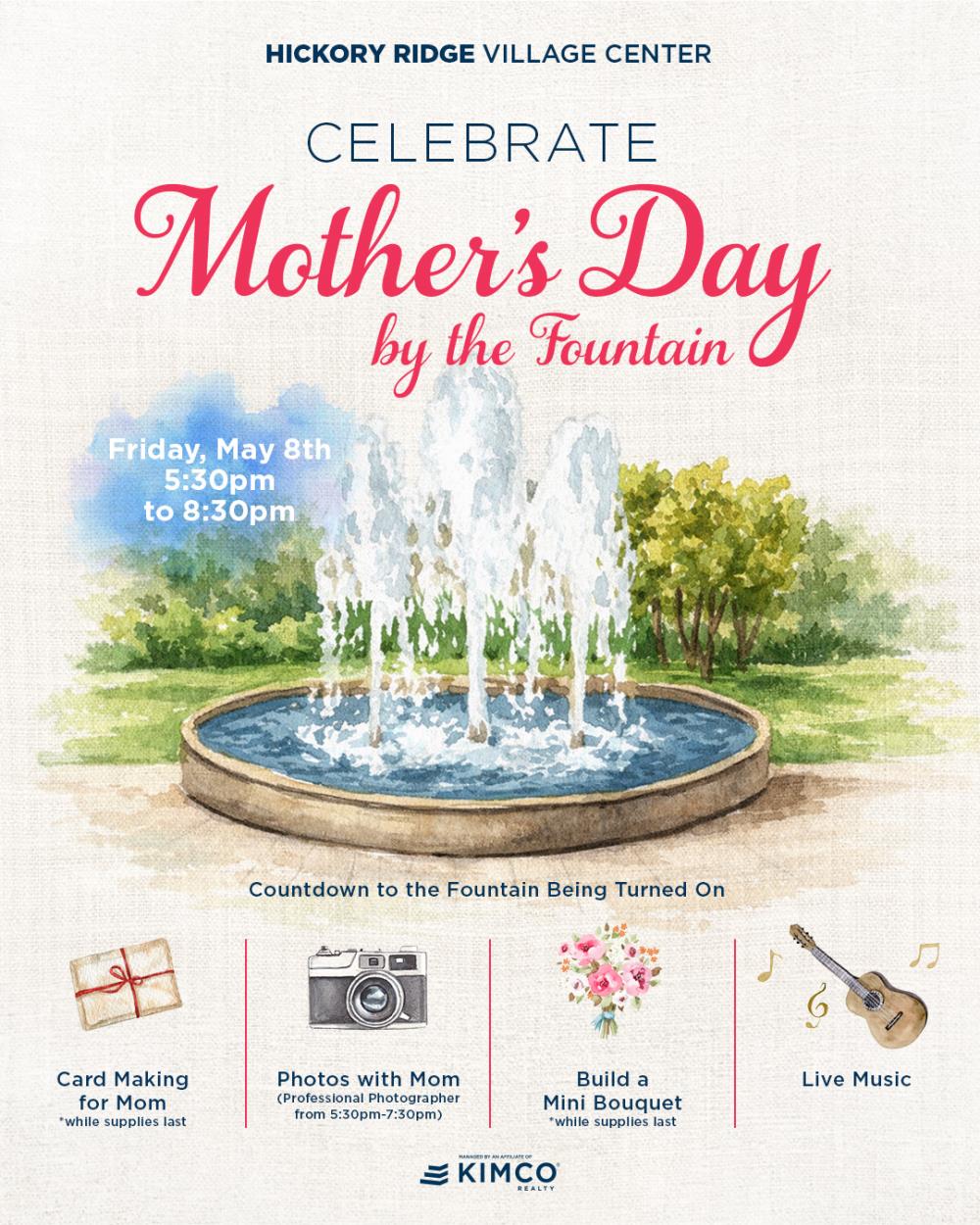 Join us for a Mother’s Day celebration by the fountain at Hickory Ridge Village Center on Friday, May 8th from 5:30 PM to 8:30 PM! Guests can enjoy card making, mini bouquet building, professional photos with Mom, and live music while we count down to the fountain turning on. A perfect family night out!